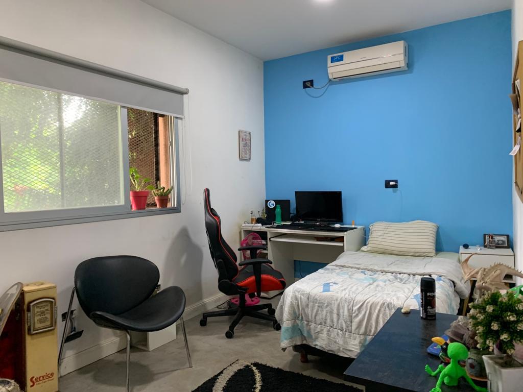 Casa en dos plantas, PB: amplio living con hogar, comedor y cocina integrados, muy luminosos, con vista al parque. Pasillo disrtibuidor a oficina y dormitorio principal con vestidor y baño en suite.